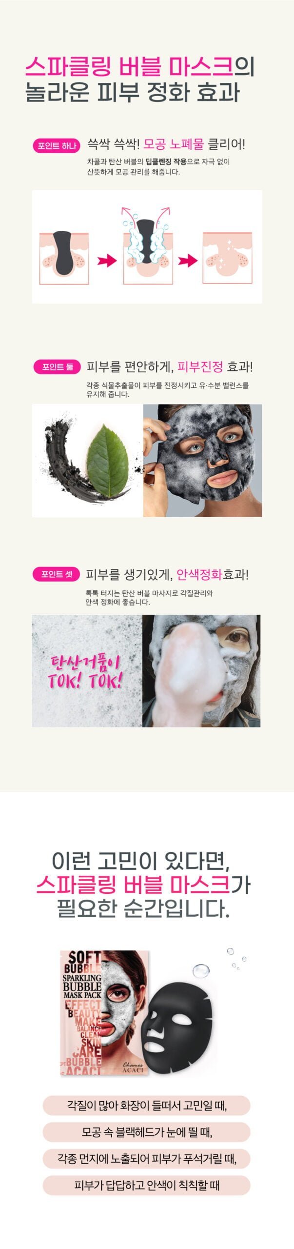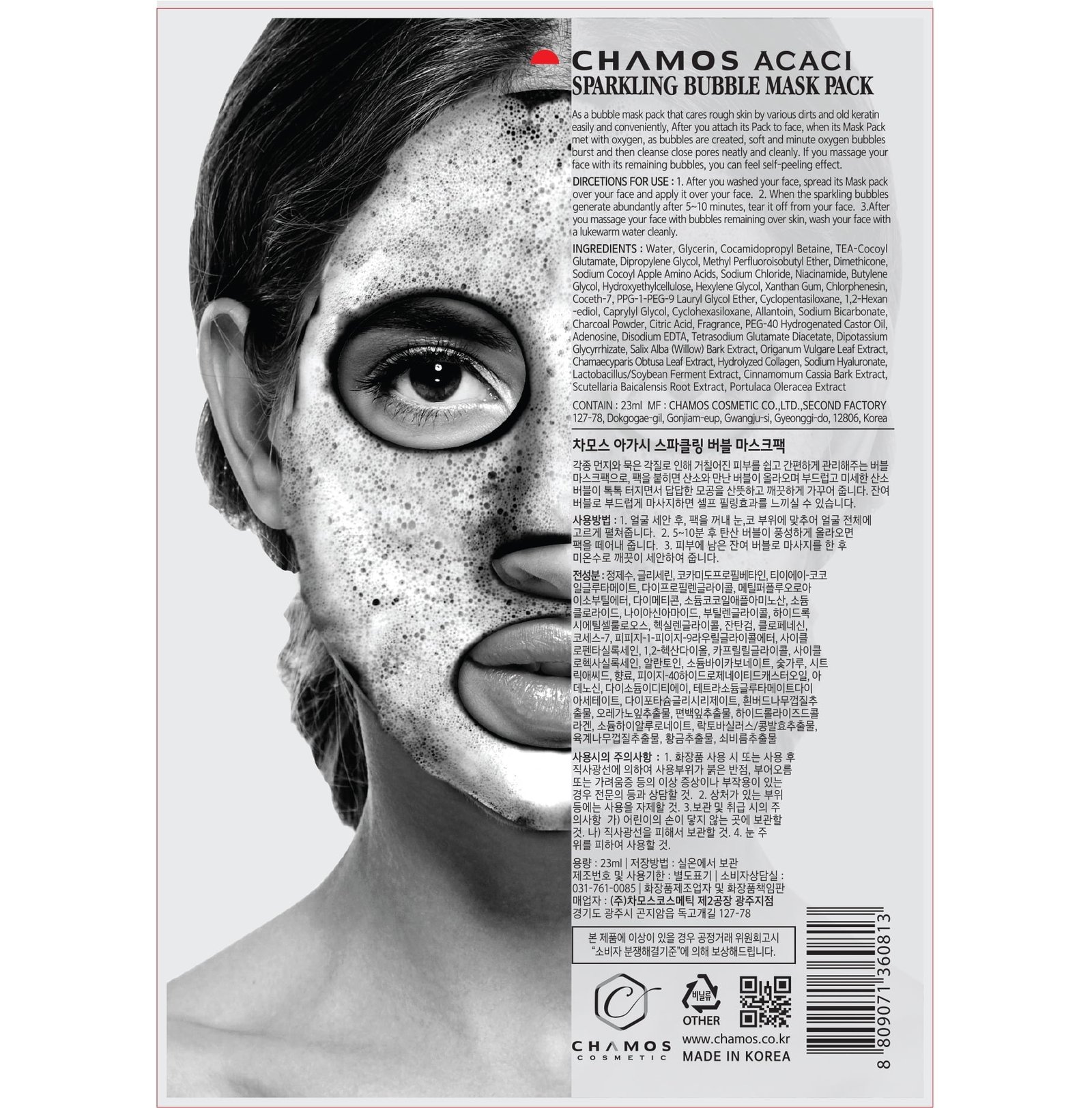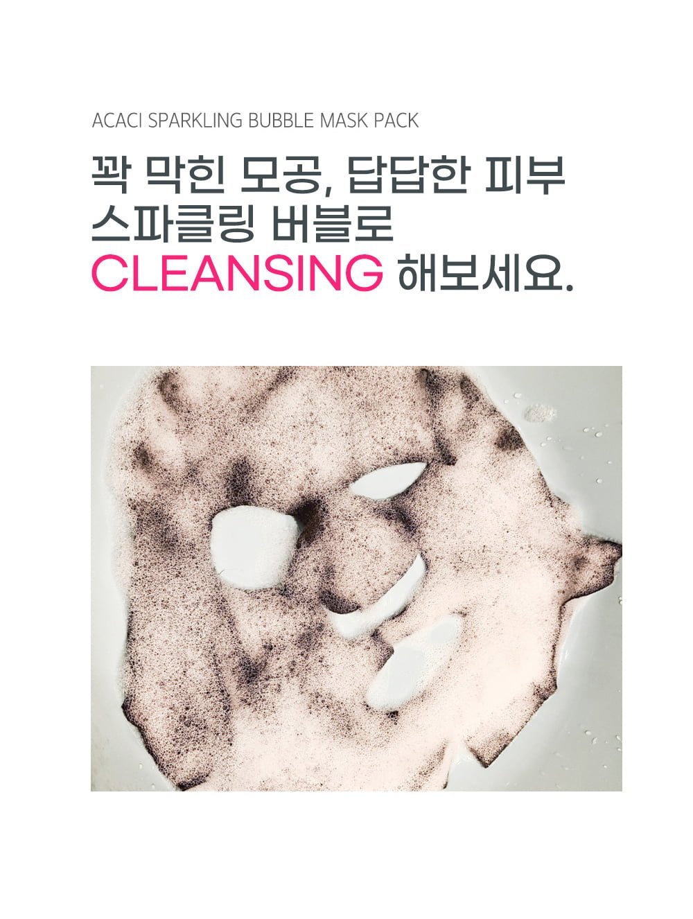Chamos ACACI SPARKLING BUBBLE MASK PACK easily and conveniently cares for rough skin from various impurities and old keratin. Once you put the pack on your face, oxygen bubbles will form, the fine and tiny oxygen bubbles will burst and then clean the narrow pores neatly and cleanly.